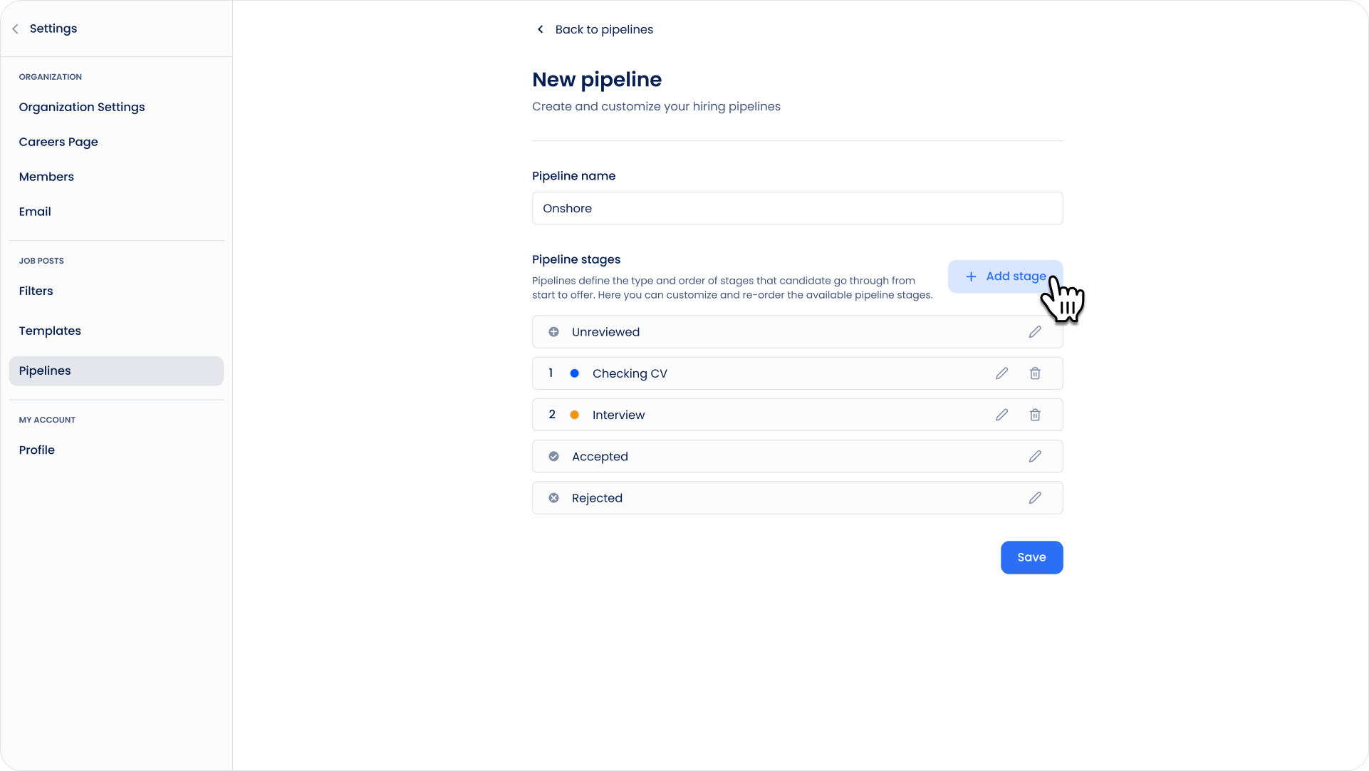5. Every new pipeline includes three default stages: Unreviewed, Accepted, and Rejected. These stages cannot be changed or removed (only renamed), but you can add extra stages to suit your recruitment process.