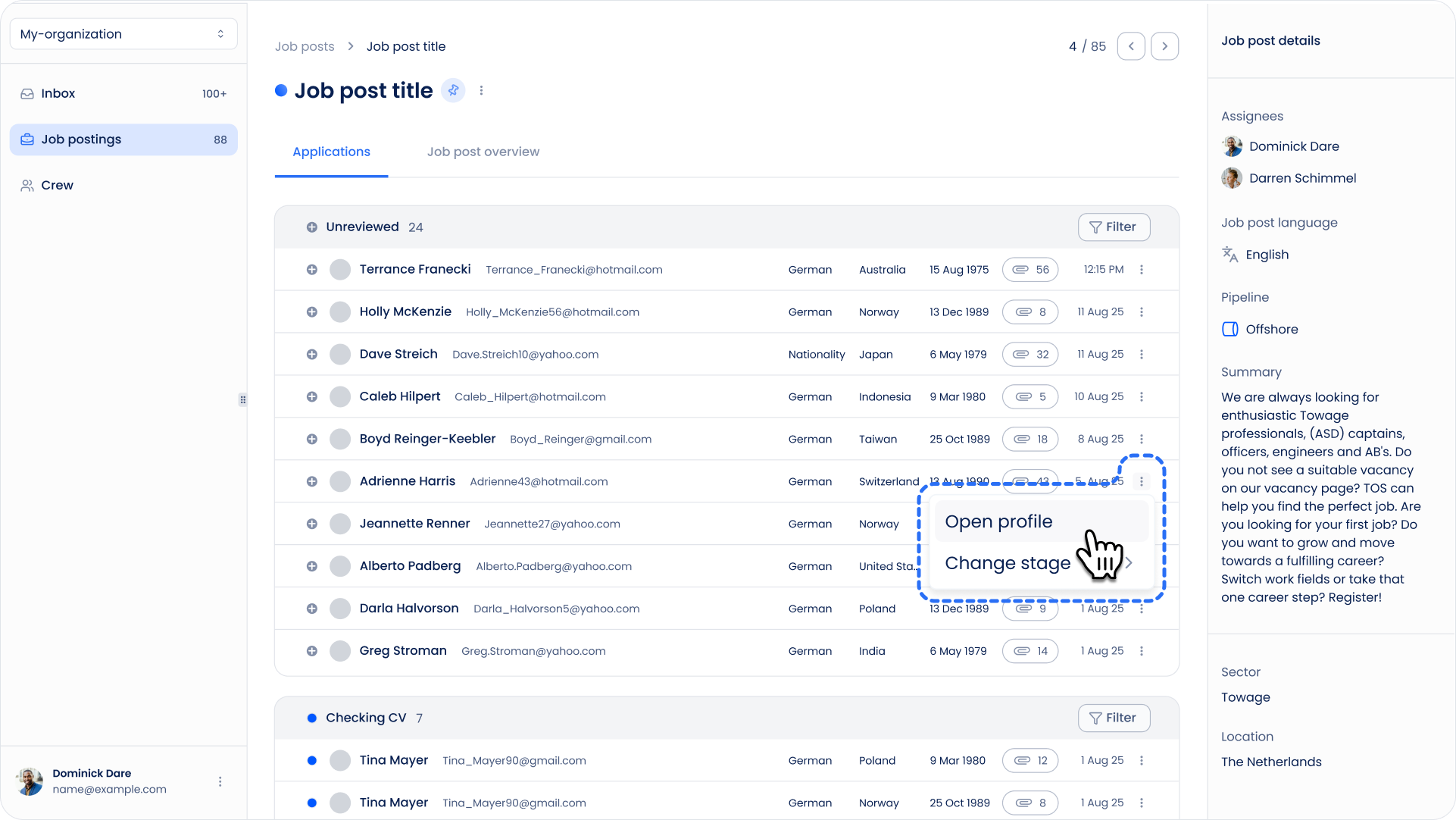 Each application has a context menu offering quick actions. Among these is the Open Profile option. Clicking this will take you directly to the candidate’s full profile, displaying comprehensive information including qualifications, work history, certifications, and documents. This feature is particularly useful when you want to review a candidate in detail without leaving the Job Postings interface.