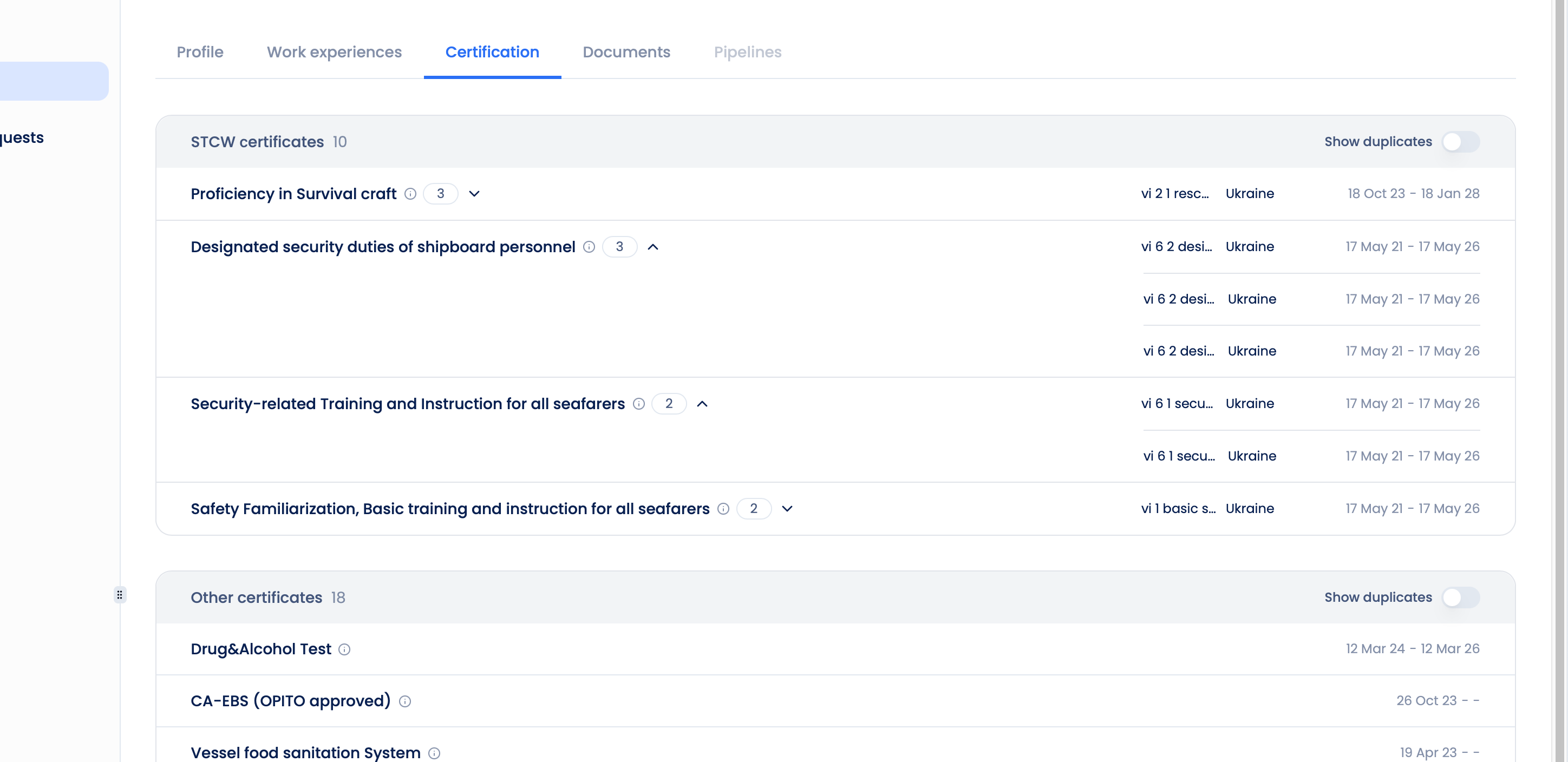 2. When crew apply for multiple job postings many duplicate items would show up under their work experience and certificates. Instead duplicates are not shown by default: